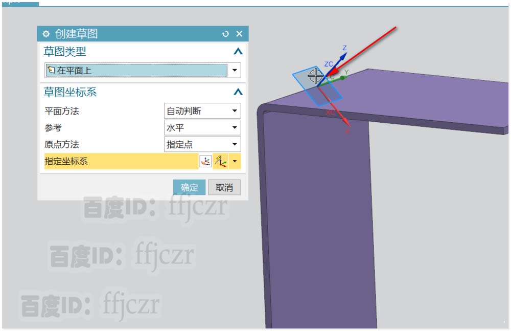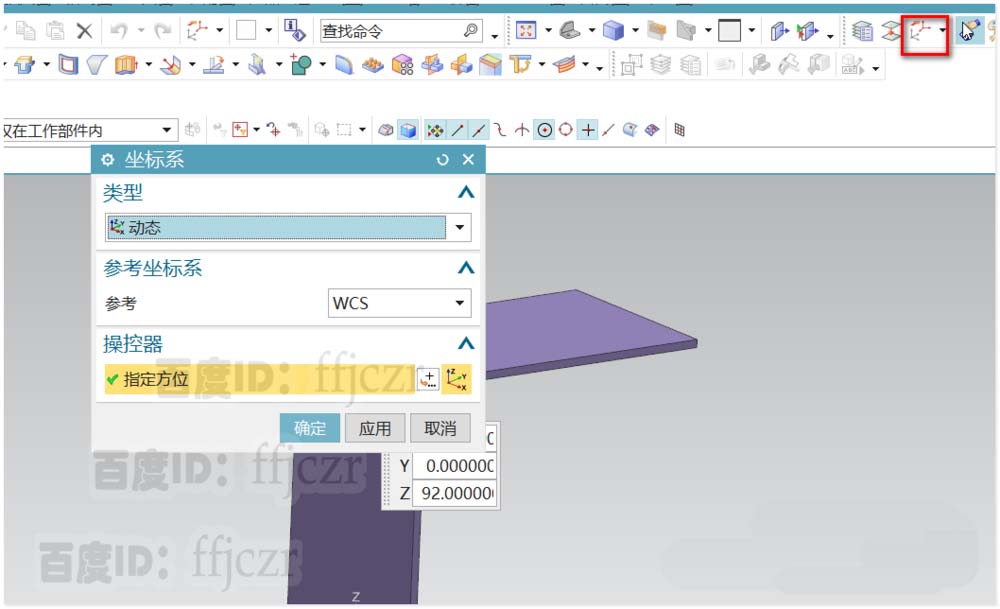 3、选用WCS定向,类型为动态。在折弯件的上直角边中点处新建一个45度倾斜的坐标。