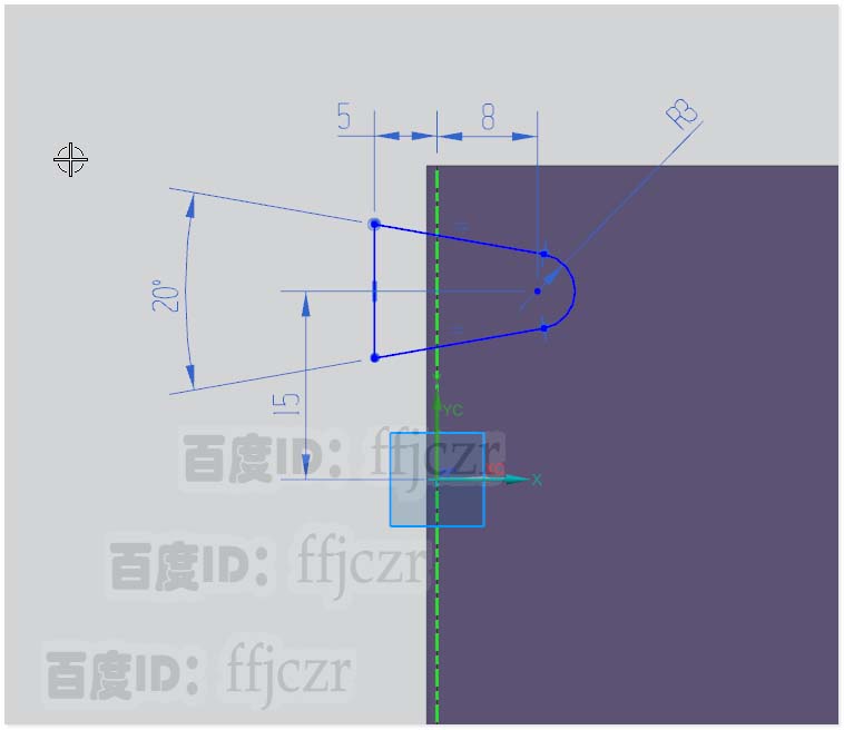 5、用标注对上步绘的轮廓进行约束定位,轮廓线圆弧的半径为3,两条相等长度的切线形成的角度为20度,圆心到X轴的距离为15,到Y轴的距离为8;与Y轴平行的竖线距离Y轴5cm. 草图完全约束,完成草绘。