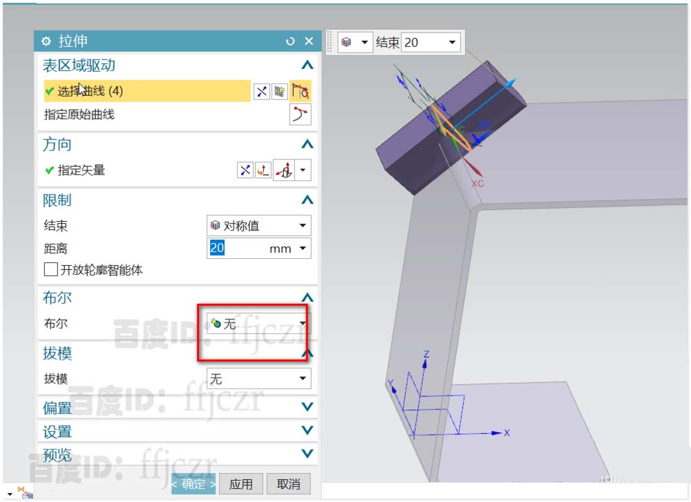 6、完成草绘后,回到拉伸对话框,类型为对称,值为20;不要选用布尔运算。得到冲压用的工具体。
