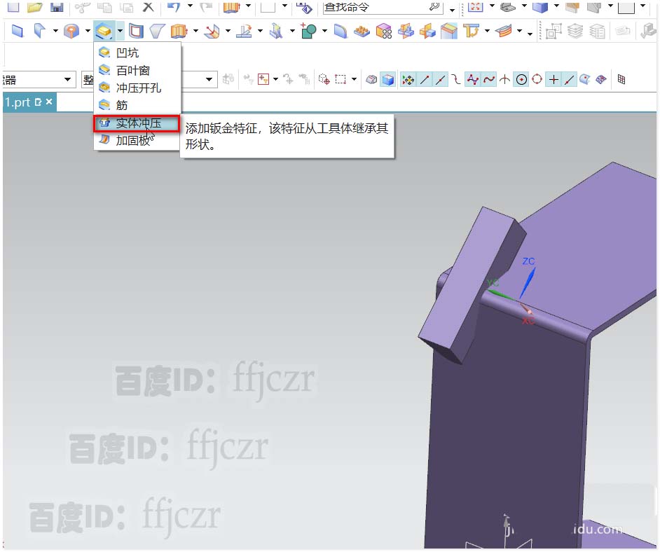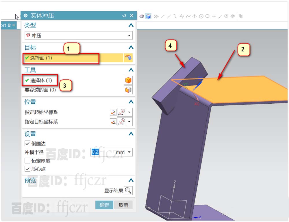 7、选用实体冲压,对话框中的目标面为折弯件上的外表面,工具体为上步创建的实体;冲压半径为0.2,确定后得到折件中的一个加强筋。