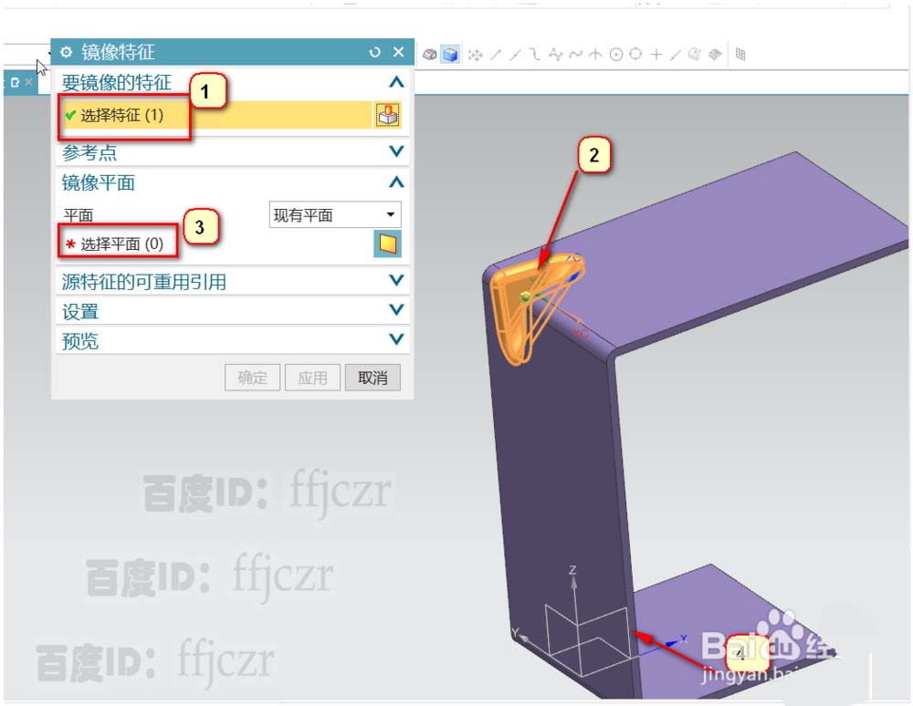 8、选用镜像特征命令,镜像特征为上步创建的加强筋;镜像平面为XZ;确定后得到另一边的加强筋。至此折弯件的加强筋创建完成。