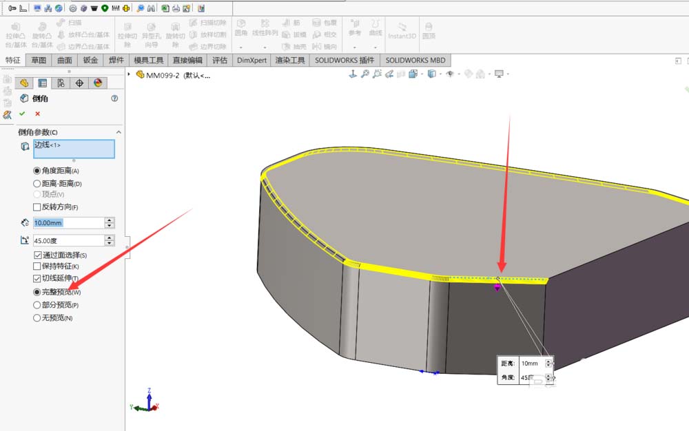 3、然后点击倒角,再点击完整预览查看倒角的效果。
