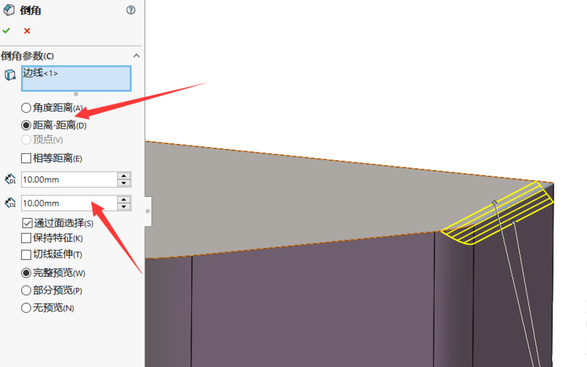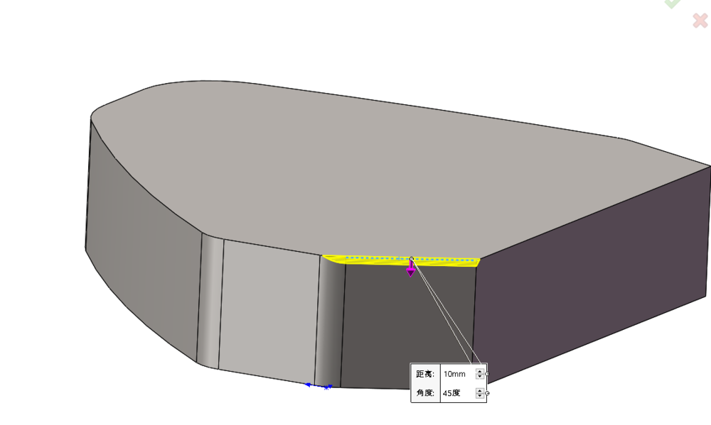6、软件里倒角可以选择度数,也可以选择距离,如果遇到不好倒角的边线,可以利用拉伸切除进行倒角。