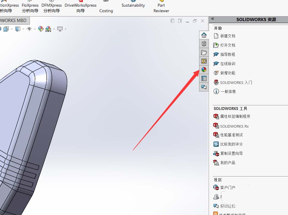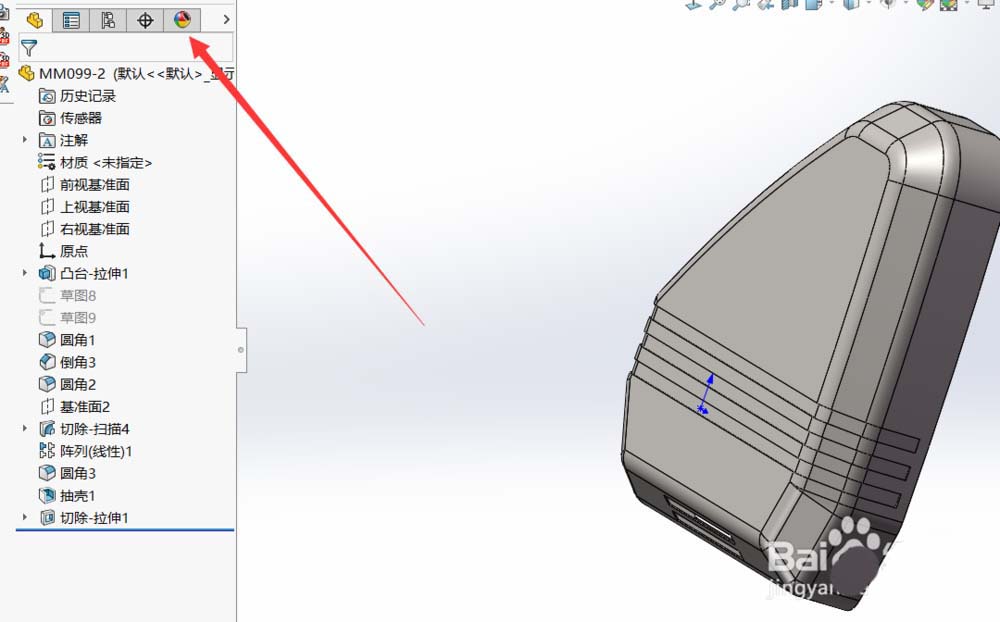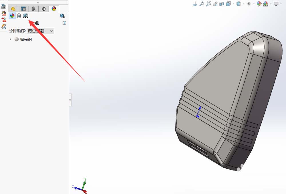 3、然后我们需要一些渲染之前的设置,在左侧的零件特征栏找到最后一个彩色的球的标志。