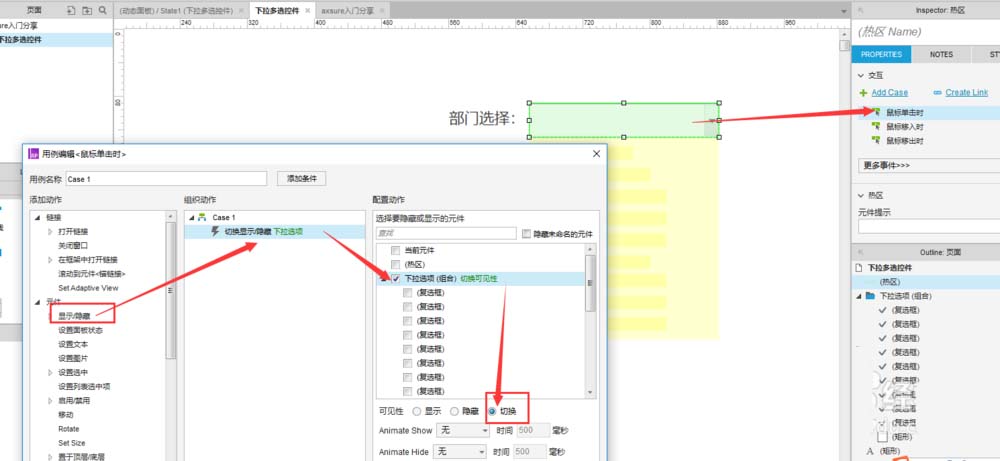 5、对热区设置交互如下:新增用例“鼠标单击时”,设置组合“下拉选项”的“可见性”为“切换”;这个用例的意思就是,鼠标点击一次时,如果组合为隐藏,则点击后为可见;如果组合为可见,则点击后隐藏。