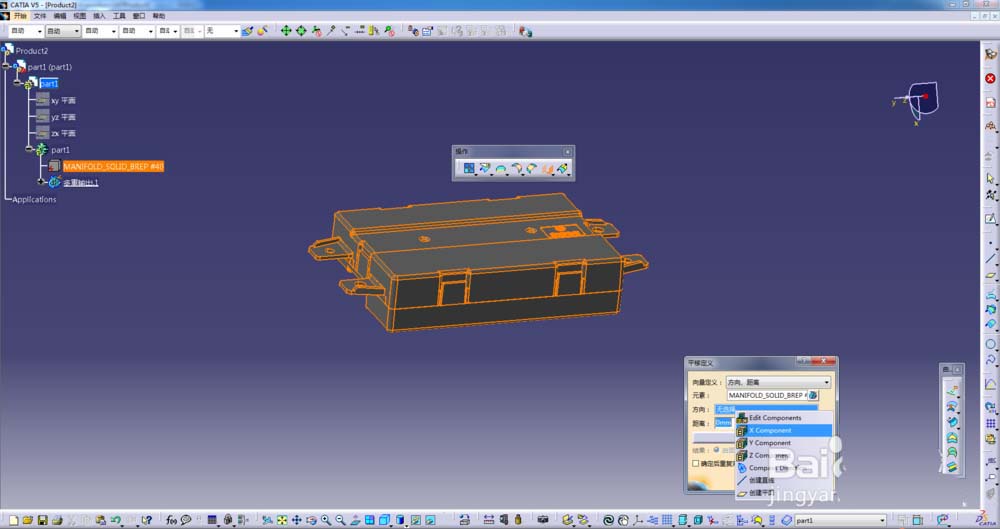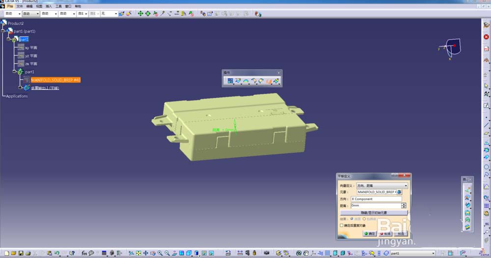 5、弹出平移定义对话框,选中需要生成面体的零件,方向选择任意方向均可,距离一定要写0,不然就和原零件的位置有差异了;