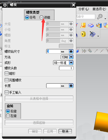 6、弹出的对话框中选择详细,不然做出的螺纹看不见