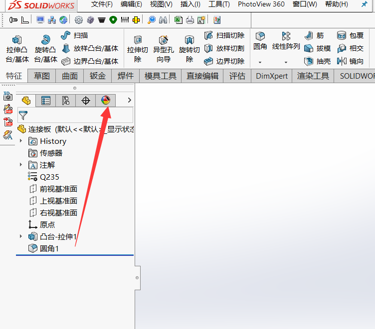 2、然后将左侧隐藏的树区域打开,也就是特征的树区域。