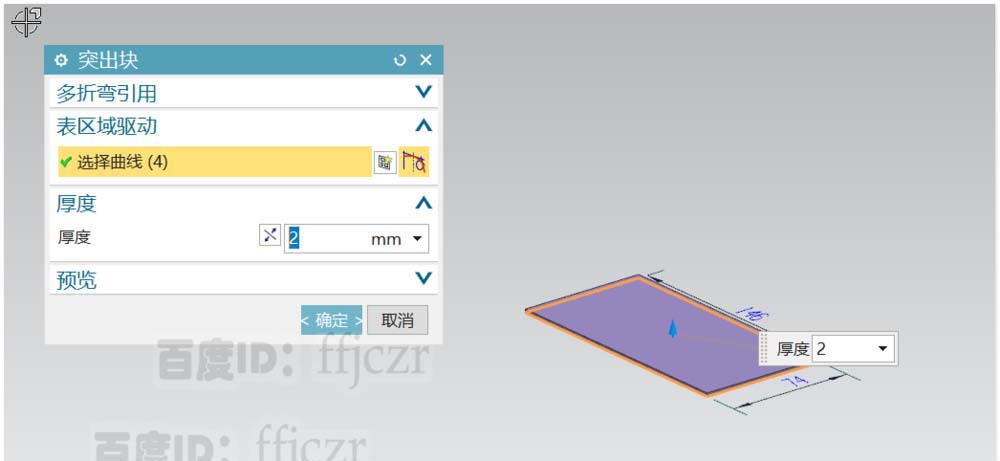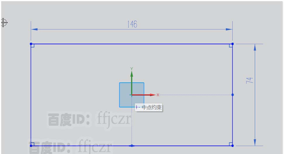 1、选用突出块,在XY面上绘出截面线,截面线为一矩形,长为146宽为74,矩形的中心与坐标原点重合。突出块的厚度为2.