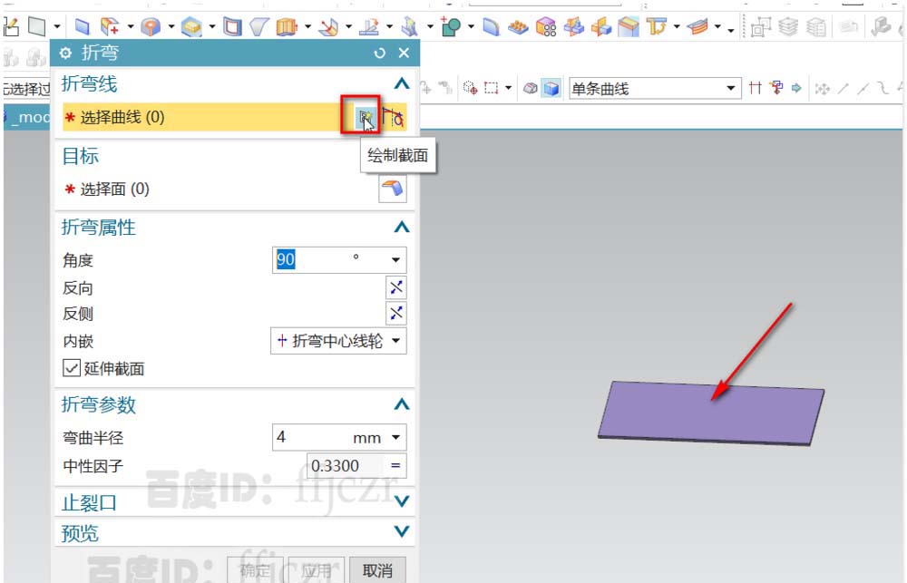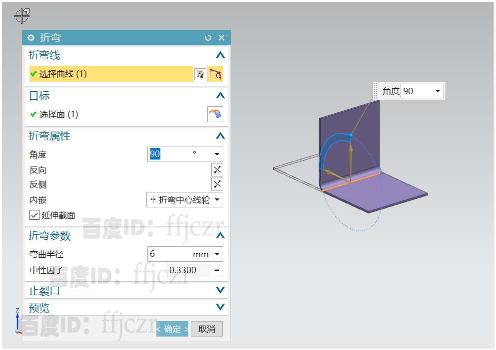 3、回到折弯对话框,折弯角度为90,内嵌为折弯中心线轮;折弯半径为6.