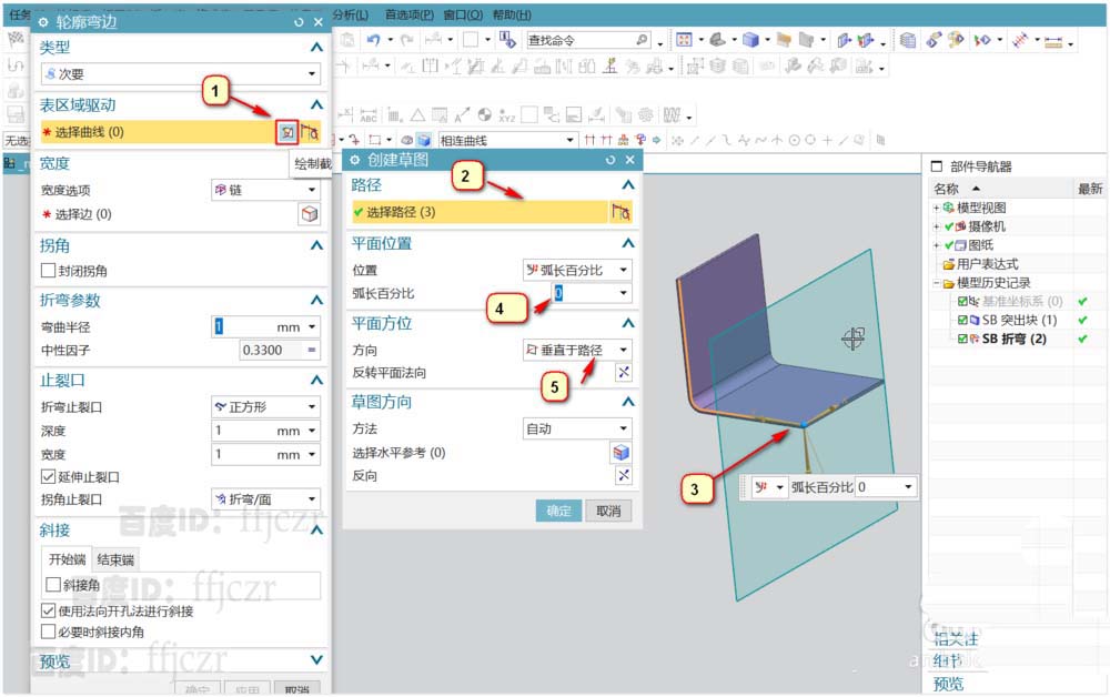 4、选用轮廓弯边,点绘制截面线,在创建草图对话框中选择路径,路径为所示的3线,平面位置为0%,方向为垂直于路径。