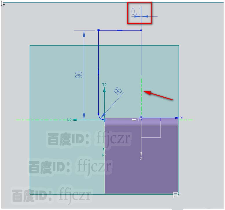 5、在草图中,用轮廓线命令,从新的坐标原点开始绘与T1相切的圆弧,其半径为6,在圆弧的另一端点绘一相切的直线,直线距离N2为90,再接着从该端点向T1绘一垂直线,垂直线的另一端点距离世界坐标的Z轴为0.1(这个0.1很重要,不要漏了)具体数值如图所示。