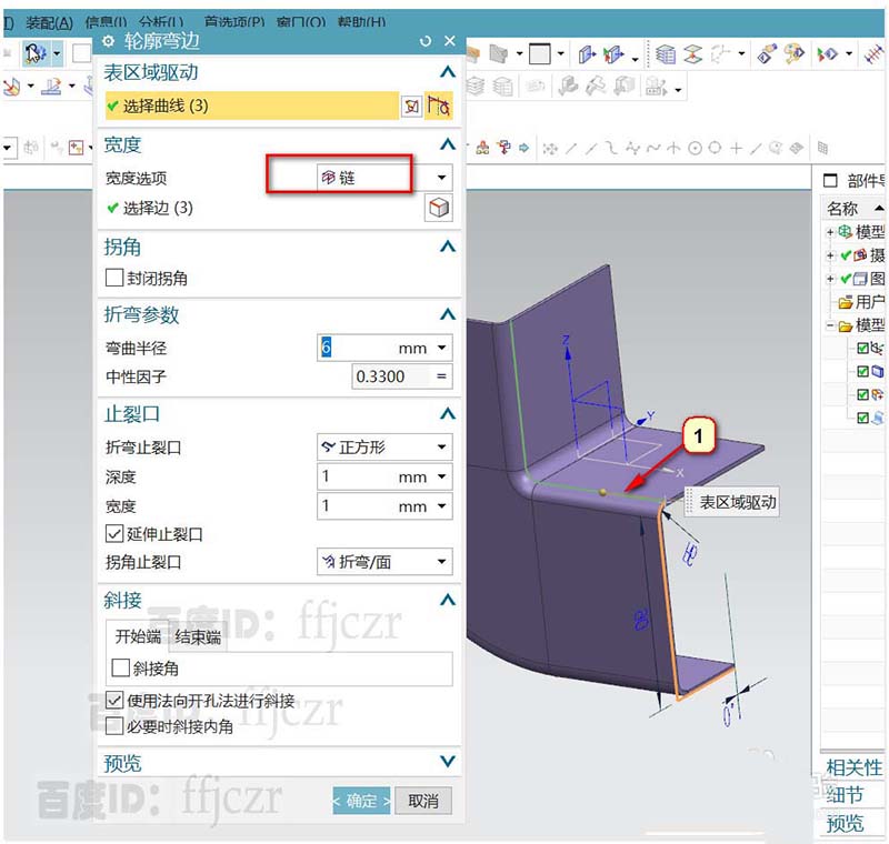 6、回到轮廓弯边对话框,宽度选项为链,弯曲半径为6,确定后得到弯管的一侧折弯造型。