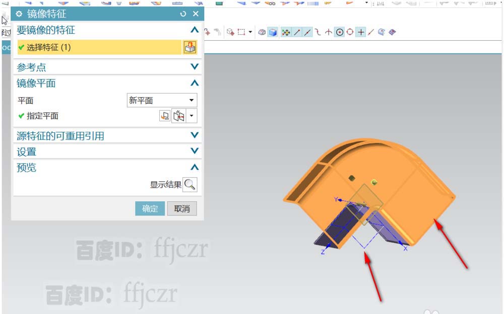 7、选用镜像特征命令,镜像的对象为上步创建的一侧折弯特征,镜像平面为XZ。确定后得到弯管的另一侧面。模型完成。