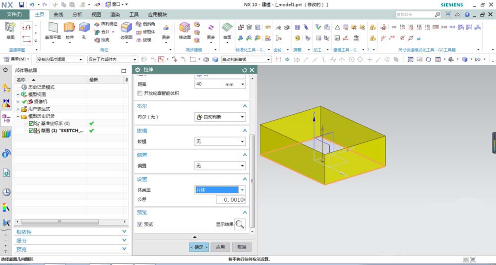 2、拉伸一个片体作为演示所用。(拉伸片体与拉伸实体的步骤是相同的,只是需要将设置中的体类型由实体改成片体就可以了)