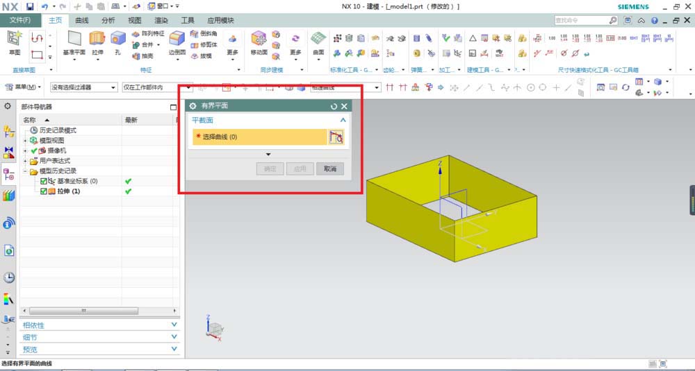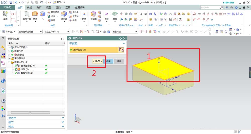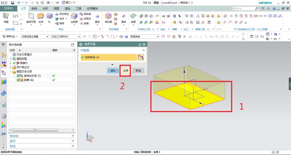 4、根据“有界平面”对话框的操作提示,我们选择四条曲线,如下图所示1号红色框选,四条封闭的直线选完之后,就出现了一个平面,然后点击2号红色框选中的“应用”按钮。因为我们还需要再创建一个有界平面,将之前拉伸的片体完全封闭起来,所以需要保留这个“有界平面”对话框。