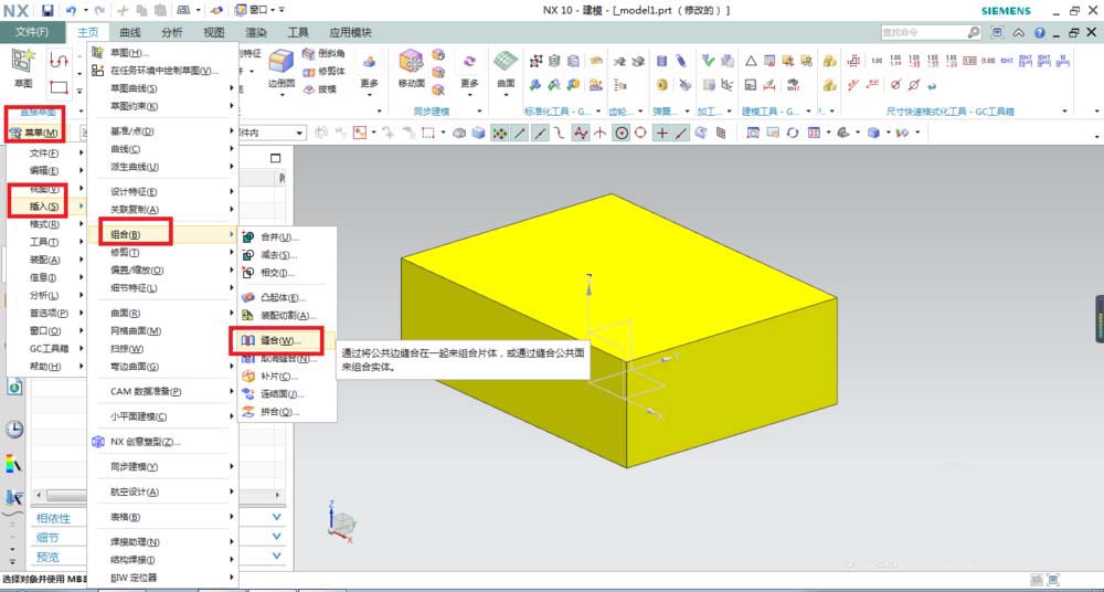 6、以上5步完全是为了下面的操作做铺垫,接下来才是“缝合”命令的具体操作步骤。如下图所示,执行【菜单】【插入】【组合】【缝合】,激活“缝合”命令。