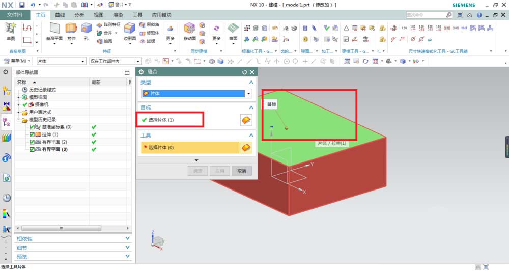 8、选择完目标片体,接下来就是选择工具片体,如下图所示选择拉伸的片体和另一个有界平面(其实就是目标片体之外的所有片体)。选择完片体之后,点击“确定”完成缝合操作