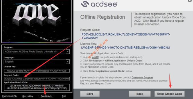 4.将request code输入到注册机,点gen unlock生成激活码,激活界面,点enter unlok code