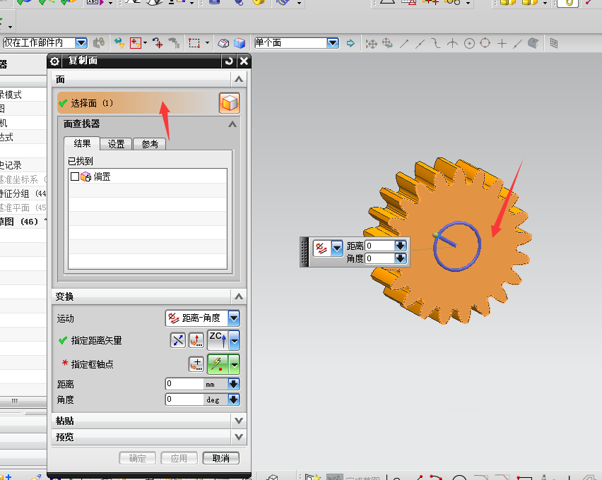 4、弹出的菜单中点击选择面,绘图区域选择一个面。比如我们选择齿轮的端面。