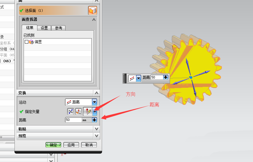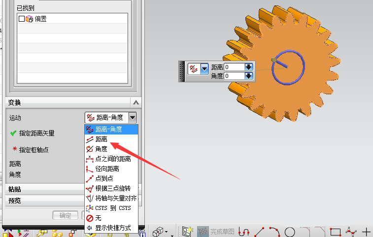 5、接下来就是要将复制的面放在那里。下拉菜单中有多种方式,我们选择距离。