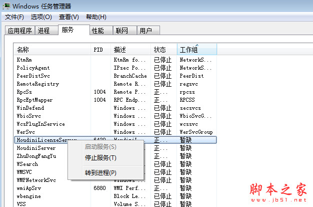 8、安装完成后先不要运行软件,打开任务管理器,点服务,找到HoudiniLicenseServer,右键点停止