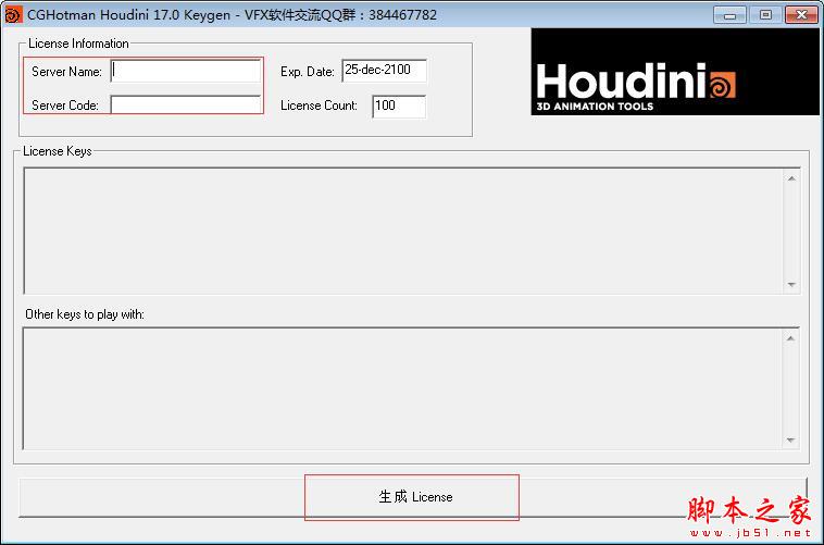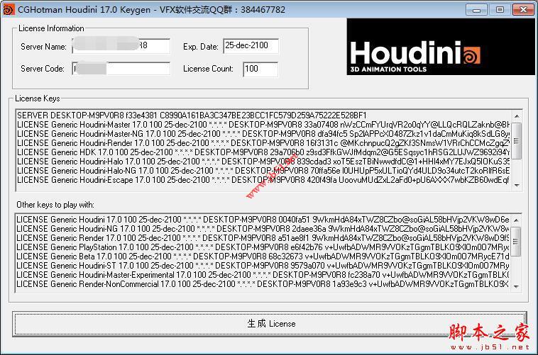 13、运行注册机houdini17.0keygen.exe,将License server host和License server code填入注册机相应位置 (其中注册机里的seruve name栏填License server host信息)