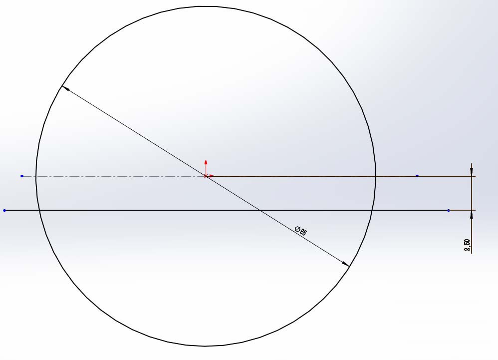 5、如下图所示,再画一条水平线,这条线距离圆心2.5mm