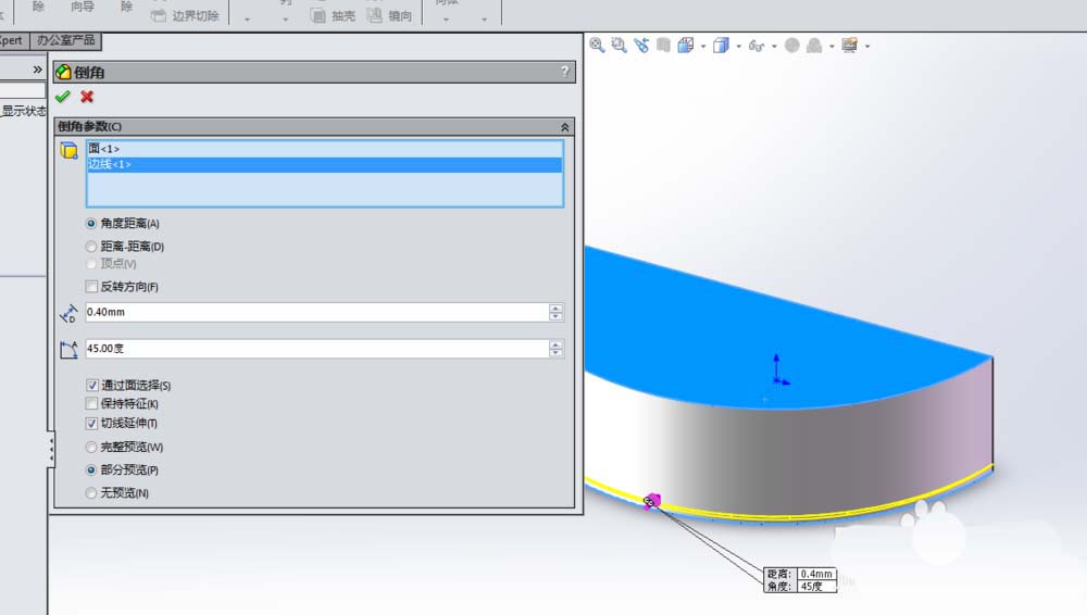 8、如下图所示,在工具栏中找到“倒角”命令,对两个圆弧进行倒角,倒角尺寸0.4mm。说明一下,“倒角”命令藏在“圆角”命令下面。