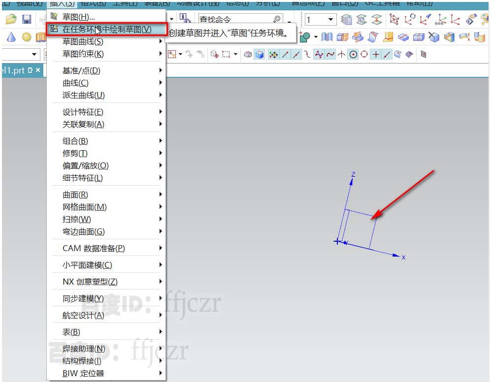 3、选用在任务环境绘草图,以XZ面为草绘平面;在草图中,用轮廓线命令依图绘出所示的截面线(照样绘即行,后面再进行约束)。