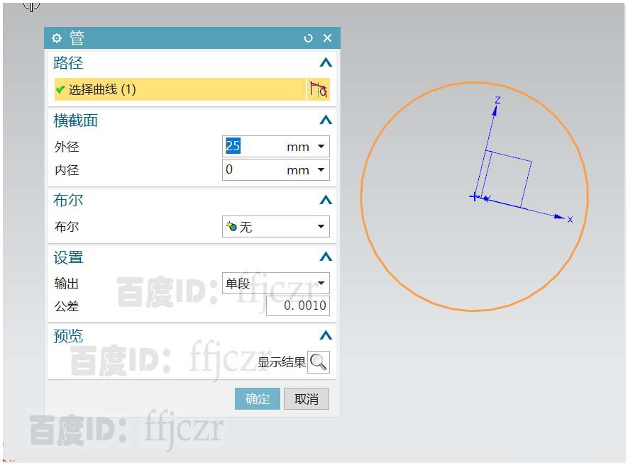 2、选用管命令,路径为上步绘出圆形;选项中的外径为25,其它参数不变。确定后得到吊环的上部分。