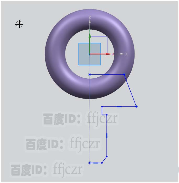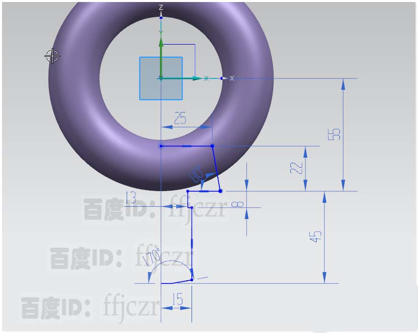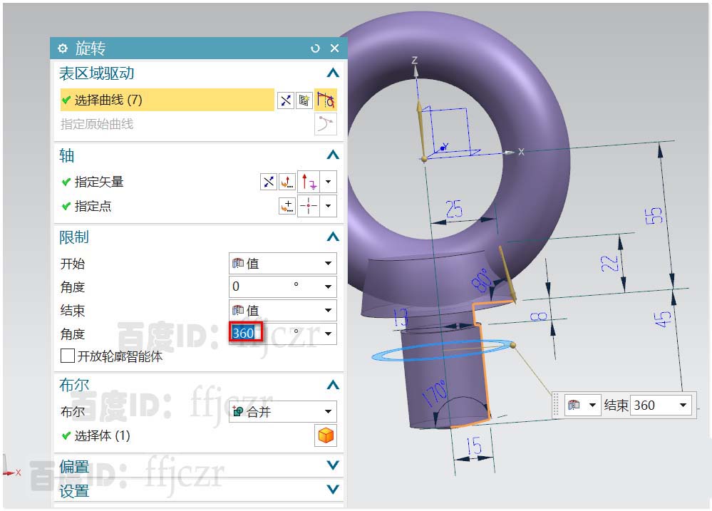 5、选用旋转命令,表面驱动为上步绘出的截面线;矢量为Z轴正向,定点为坐标原点。角度为360.确定后得到吊环的下部分。