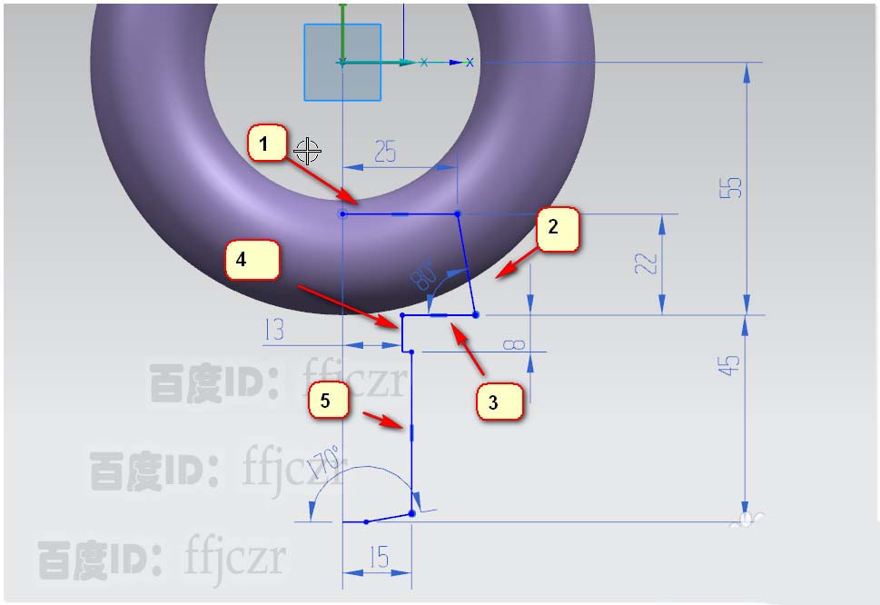 4、首先约束1、3线为水平;4、5为竖直;1线的一端点在Y轴上,长为25,2线与3线成80度;4线与Y轴的距离为13,5线与Y轴的距离为15(具体参数可参考所给引用图)。