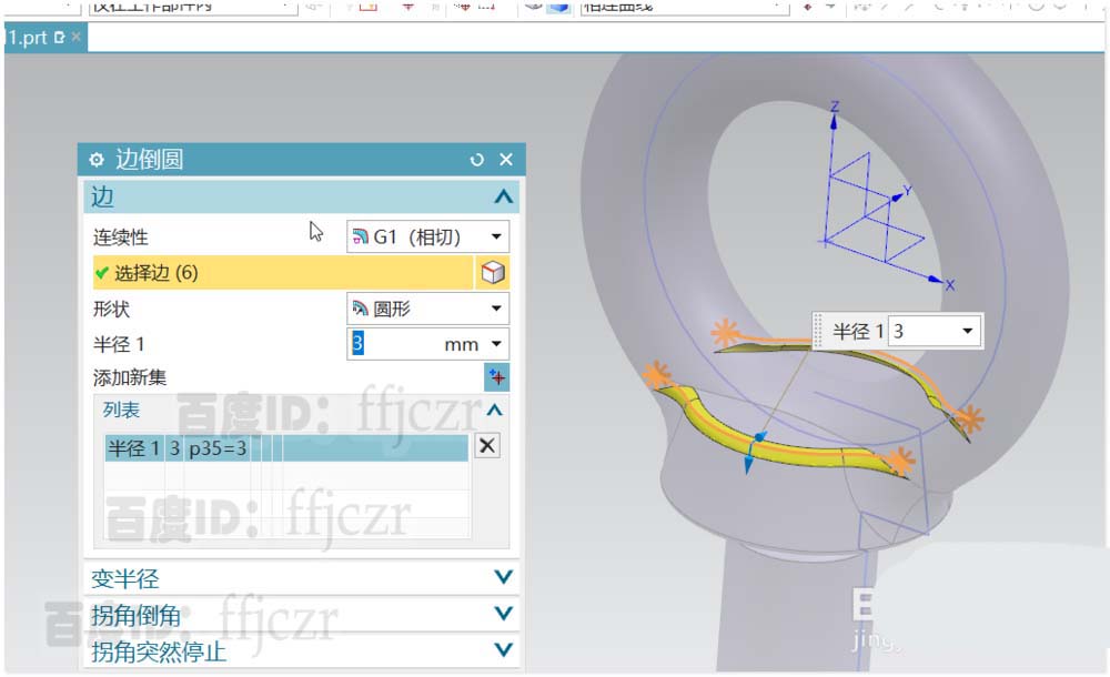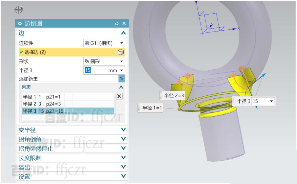 6、选用倒圆角命令,分别添加1、3、15的圆角半径。对图示的边进行倒角。