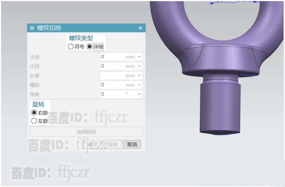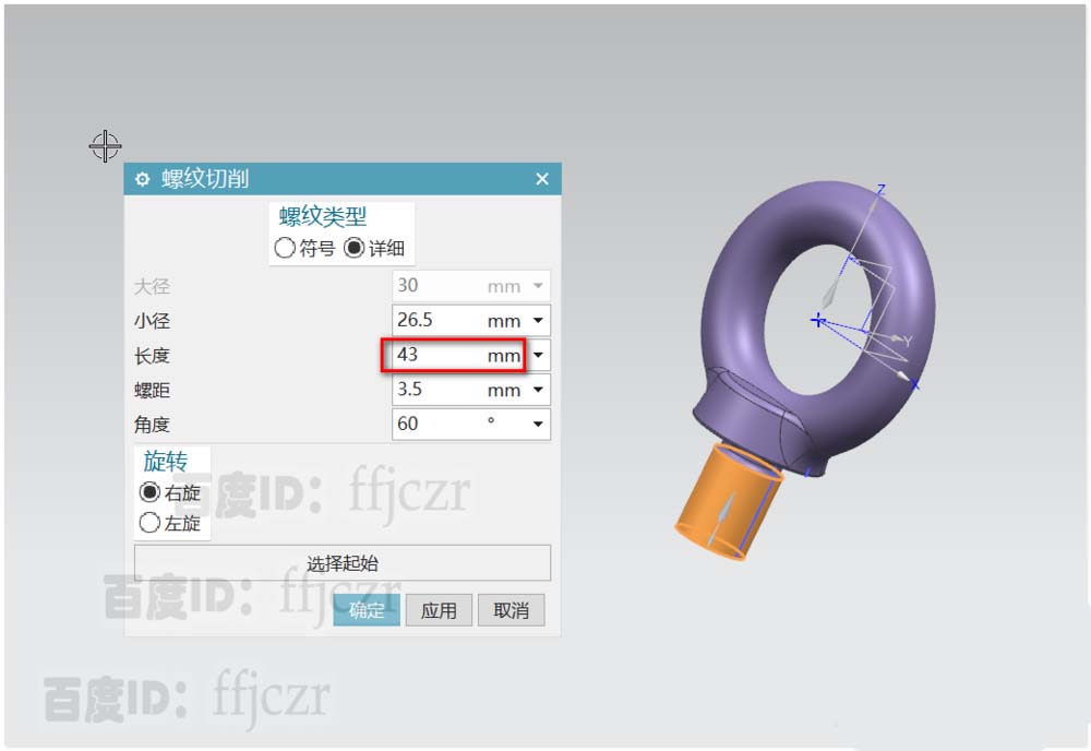 7、选用螺纹刀命令,类型为详细,旋转为右旋;选择圆柱面为螺纹的生成面,起始面为圆柱的最底面,最后在螺纹属性中修改长度为43;确定后即可得到M30的螺纹。模型创建完成。