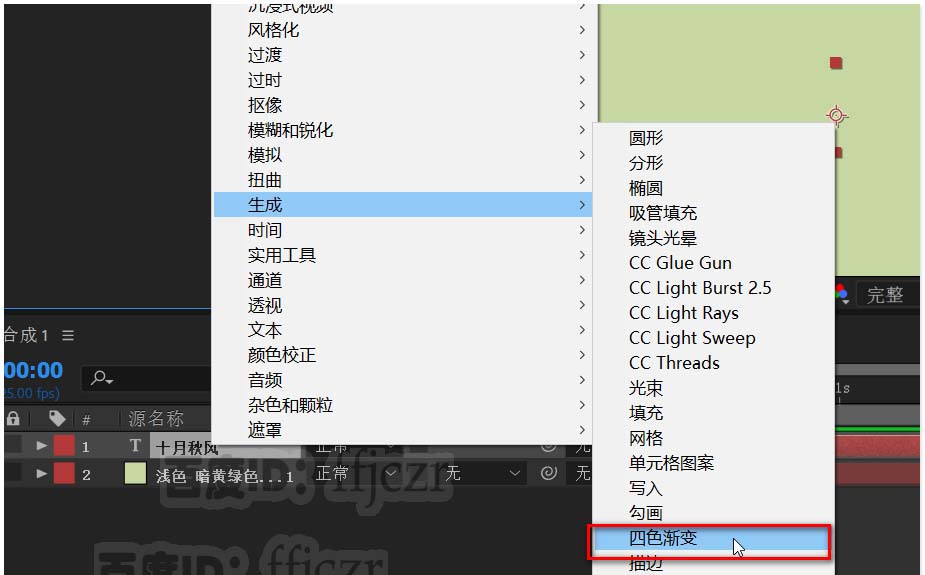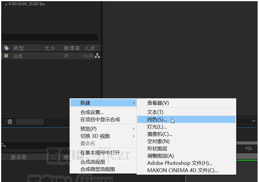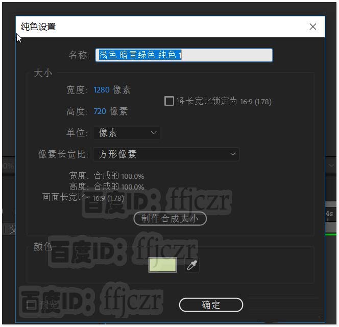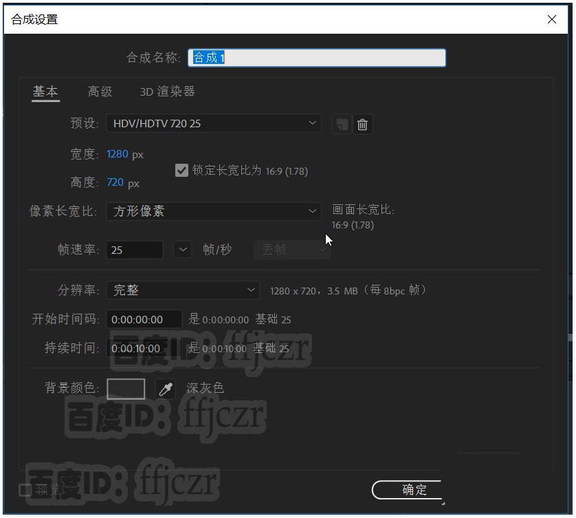 1、新建一个合成项目,分辨率为1280*720;方形像素,25帧率。在合成层中新建一纯色层,作为该合成的背景(颜色自定)。