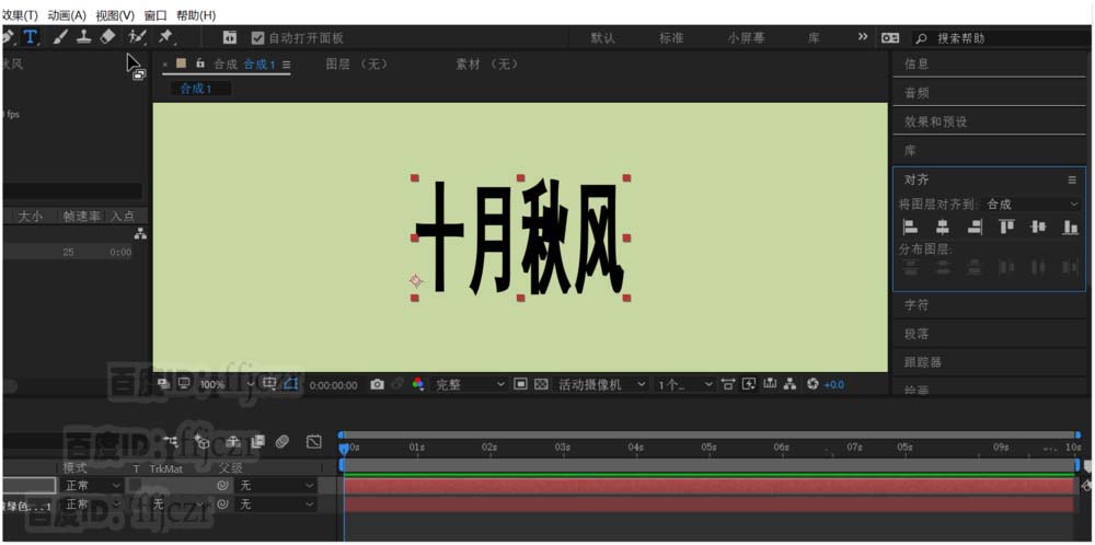 2、在合成层添加一个文本层,在显示区输入相应文字,并将文字居中显示。