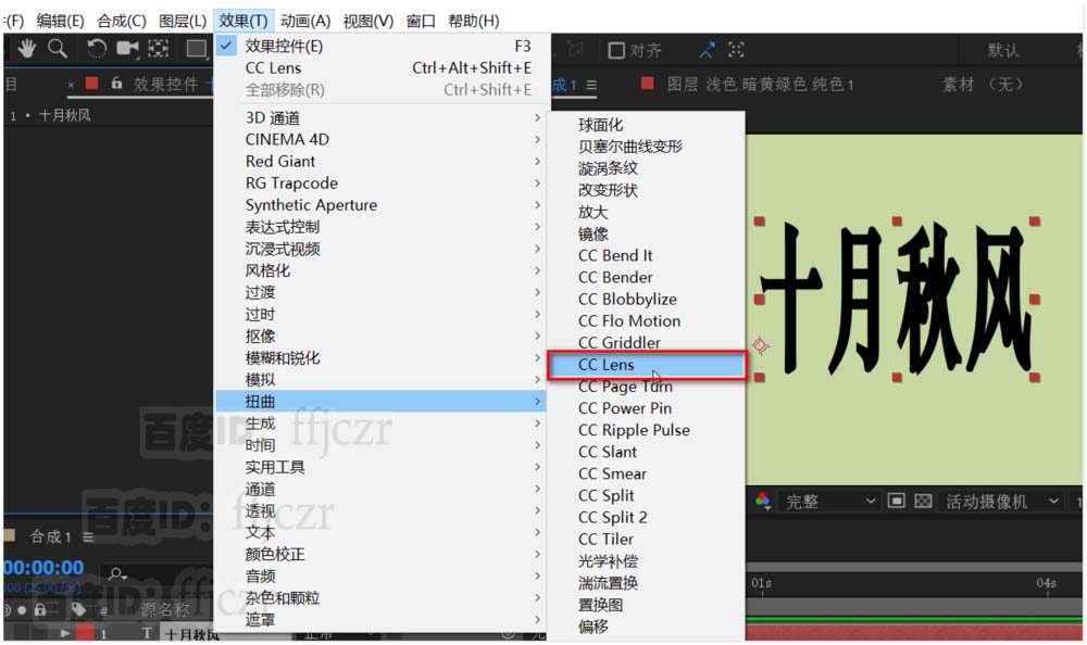 3、给文本层添加效果,扭曲中的CC Lens.这是一个透镜效果。