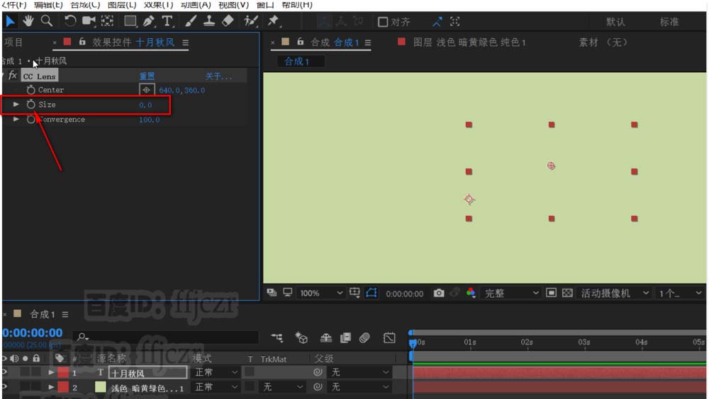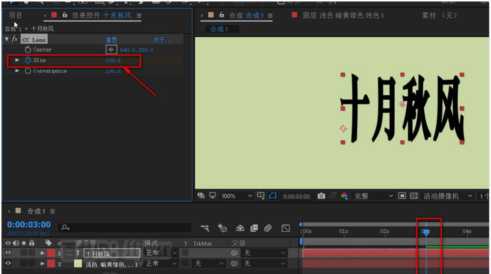 5、时间线为3时,Size选项值为100;此时文字正常显示。点播放,可以看到文字因CC Lens的效果产生了从无到有,从小到大产生的动画。