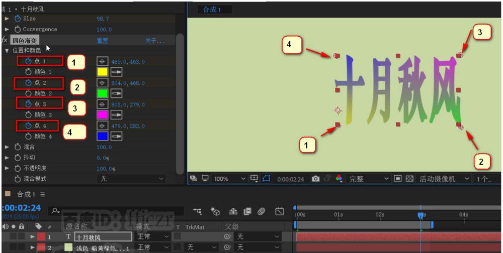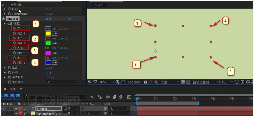 6、再给文字添加一个四色渐变的效果;在时间线为0时,激活四色定位点的关键帧,并依图示,对四色在文本上进行定位。