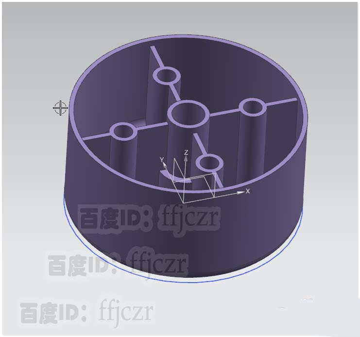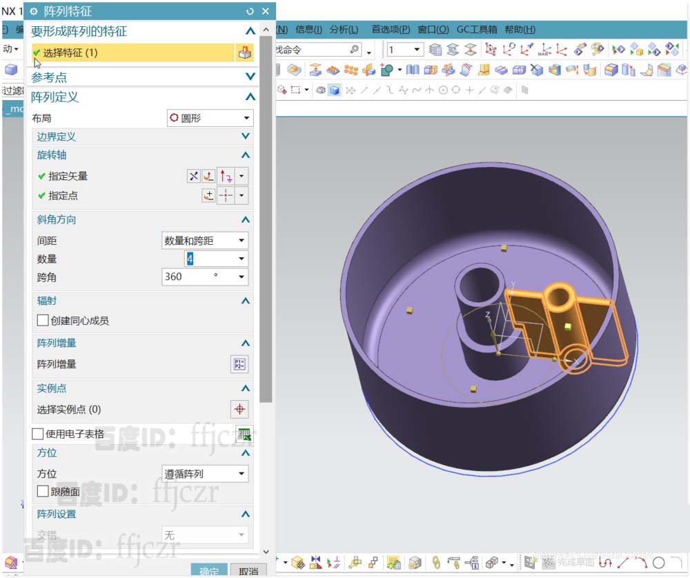 7、选用阵列特征命令,对上步创建的一组加强筋进行圆表阵列,矢量为Z正向,定点为坐标原点,数量这4,跨角为360度。确定后即可得到四组均匀阵列的加强筋。
