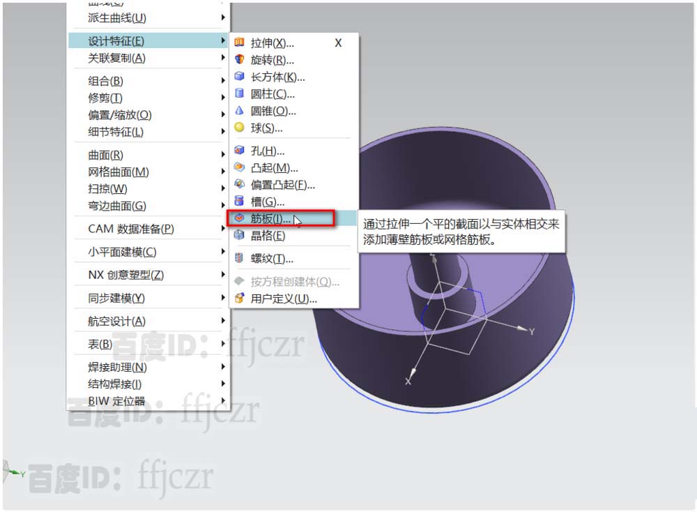 2、鼠标点开插入菜单,选择设计特征,在展开的列表中找到筋板命令。