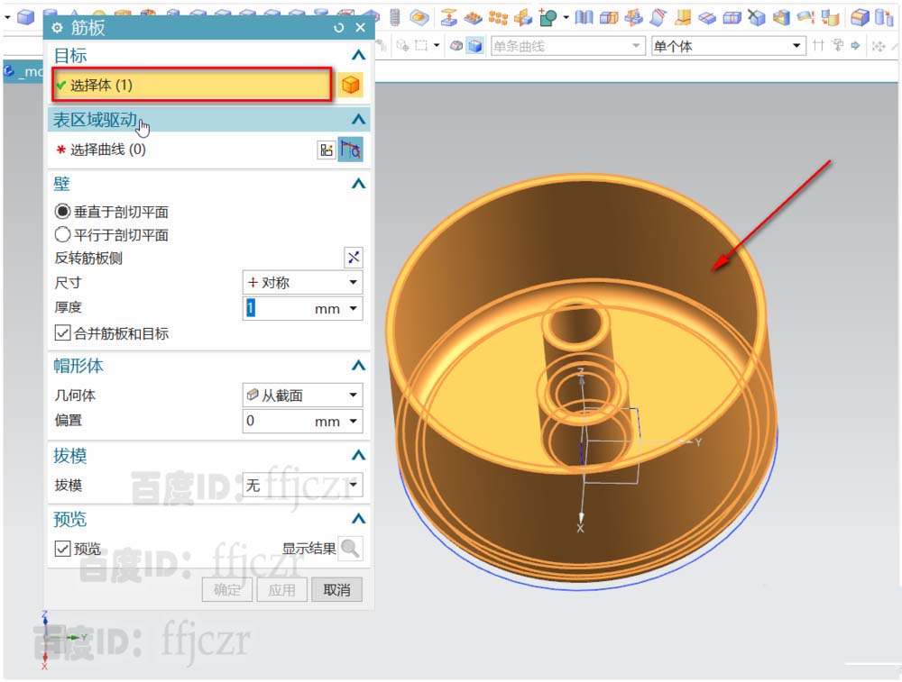 UG12.0中的模型为一圆柱体,其内有一带沉头的抽壳体,要想保持沉头的稳定,就要对其添加加强筋了,该怎么创建加强筋呢?下面我们就来看看详细的教程。
