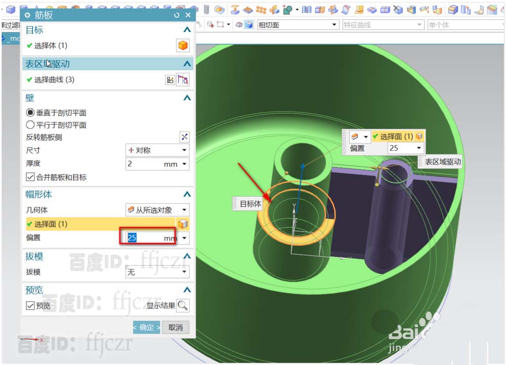 6、回到筋板对话框,将壁改为垂直于剖切面,尺寸为对称,值为2;帽形体选择从所选的对象,这里选择沉孔的端面(如图所示),勾选合并筋板和对象,偏置值为25.确定后即可得到一组加强筋。