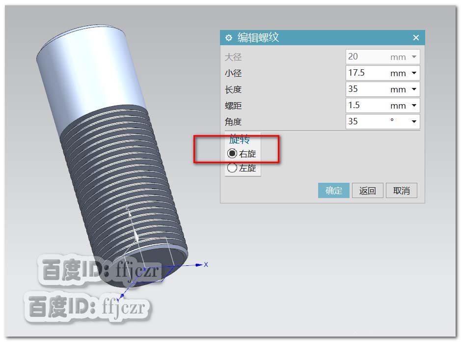 3、在弹出螺纹编辑对话框中,选择螺纹的旋转为右旋,长度为35,角度为35,螺距为1.5.确定后,即可得到圆柱体下端的一段螺纹。