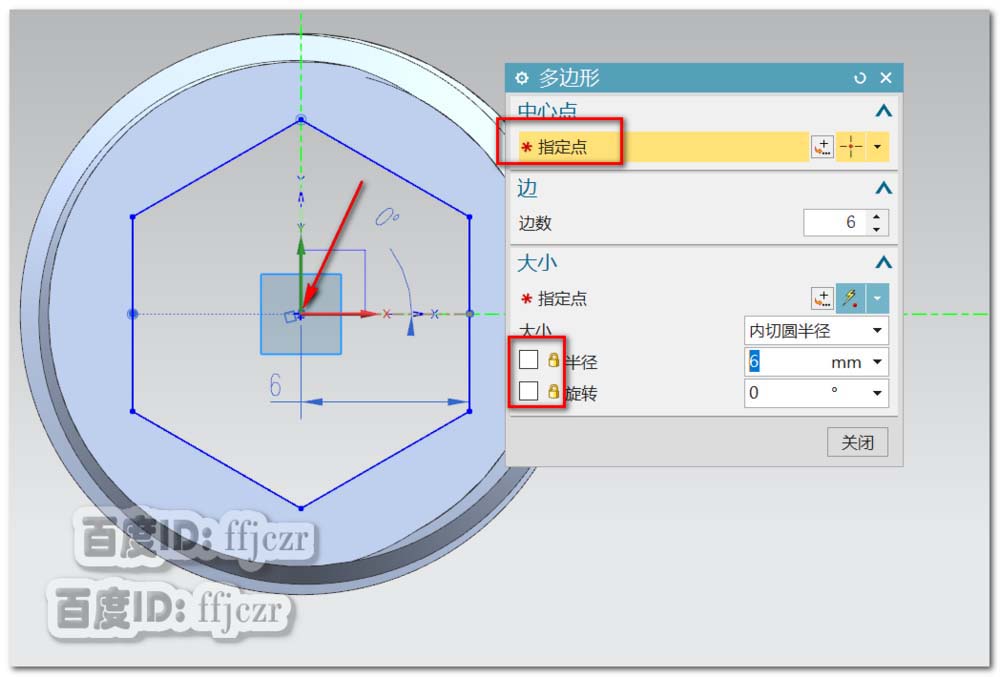 8、一般上,这样的正反螺纹,是需要用六角扳手来安装的。选用拉伸命令,以圆柱体的上端面为草绘平面(短螺纹一端的上表面);在草图中选用多边形,边数为6,中心点在坐标原点,锁定半径为6,旋转角度为0.回到拉伸命令,结束方式选用贯通,布尔方式为减去。
