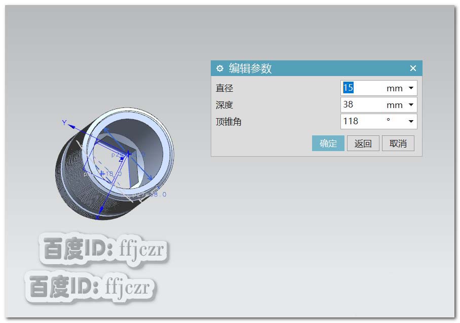 9、选用开孔命令,在长螺纹的一端,以圆心为定点,开孔直径为15,深度为38。模型创建完成。
