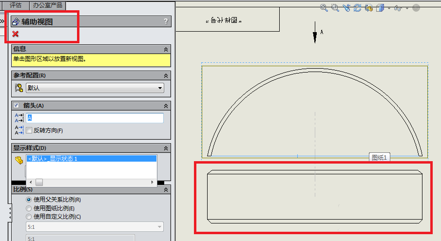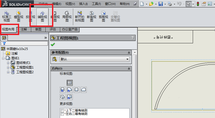 4、如下图所示,弹出“辅助视图”对话框,同时出现的还有工程图中的预览效果。