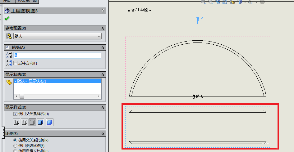 5、如下图所示,选择位置,放置辅助视图,当我们 用鼠标在工程图中点击之后,辅助视图放置完毕,则表示辅助视图创建成功了。然后就如下图所示,“辅助视图”对话框就消失了,只留下了”工程图视图”。