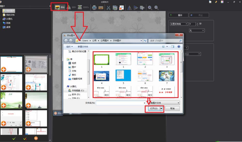 2、打开动画制作界面后点击:添加——然后选择自己所有要制作动画的图片——点击打开,开始添加图片。